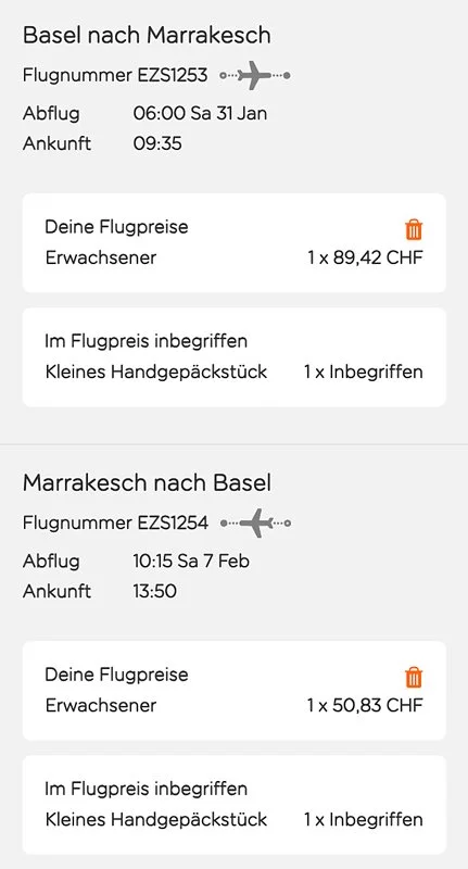 Deinen Flug buchst Du direkt bei EasyJet oder Edelweiss Air gemĂ€ss Deinen Ab- & RĂŒckflug, GepĂ€ck- und Sitzplatz-WĂŒnsche selber đ
