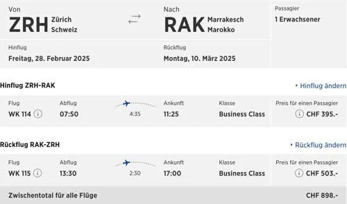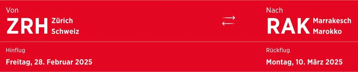 Deinen Flug buchst Du direkt bei Edelweiss Air ab Zürich nach Marrakech gemäss Deinen Ab- & Rückflug, Gepäck- und Sitzplatz-Wünsche selber 😊